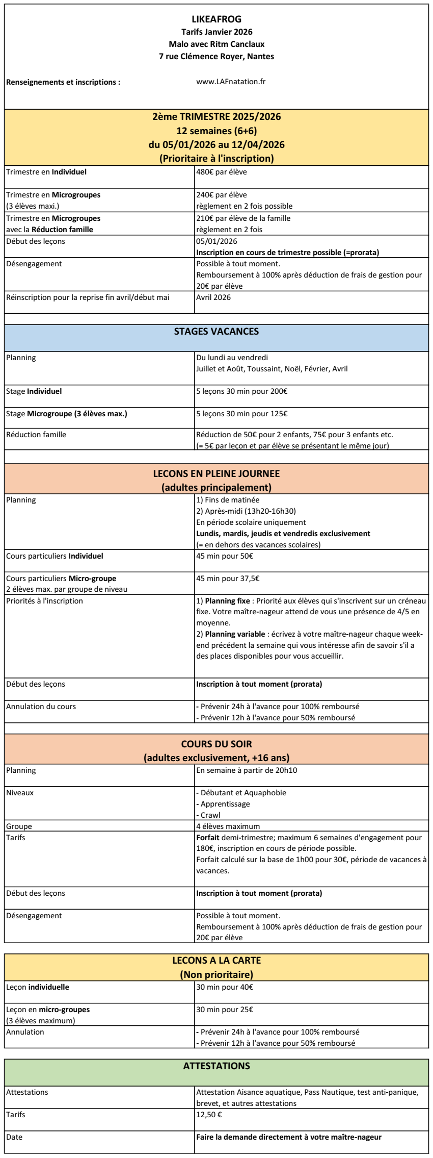 Tarifs 2ème trimestre 2025/2026 – Janvier 2026 : du 05/01/2026 au 12/04/2026